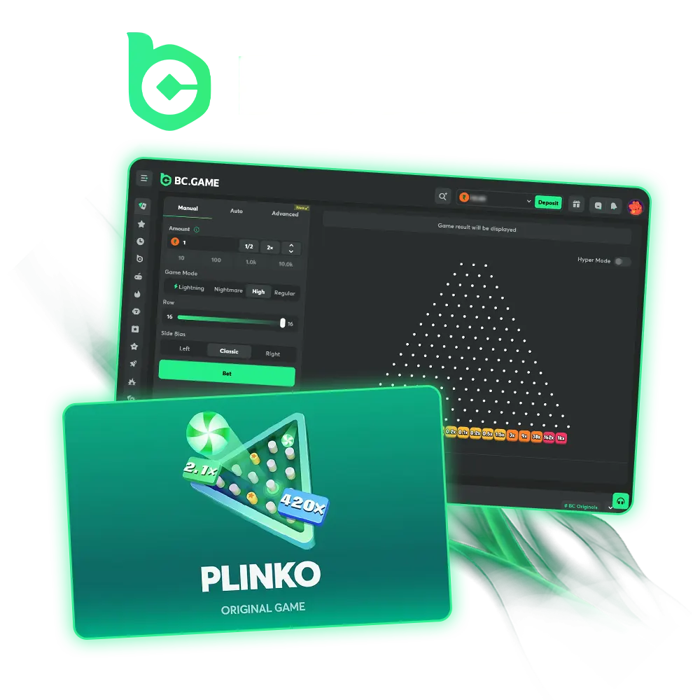 Plinko is a BC Originals game where a ball drops through pins and lands on a multiplier that defines the payout.